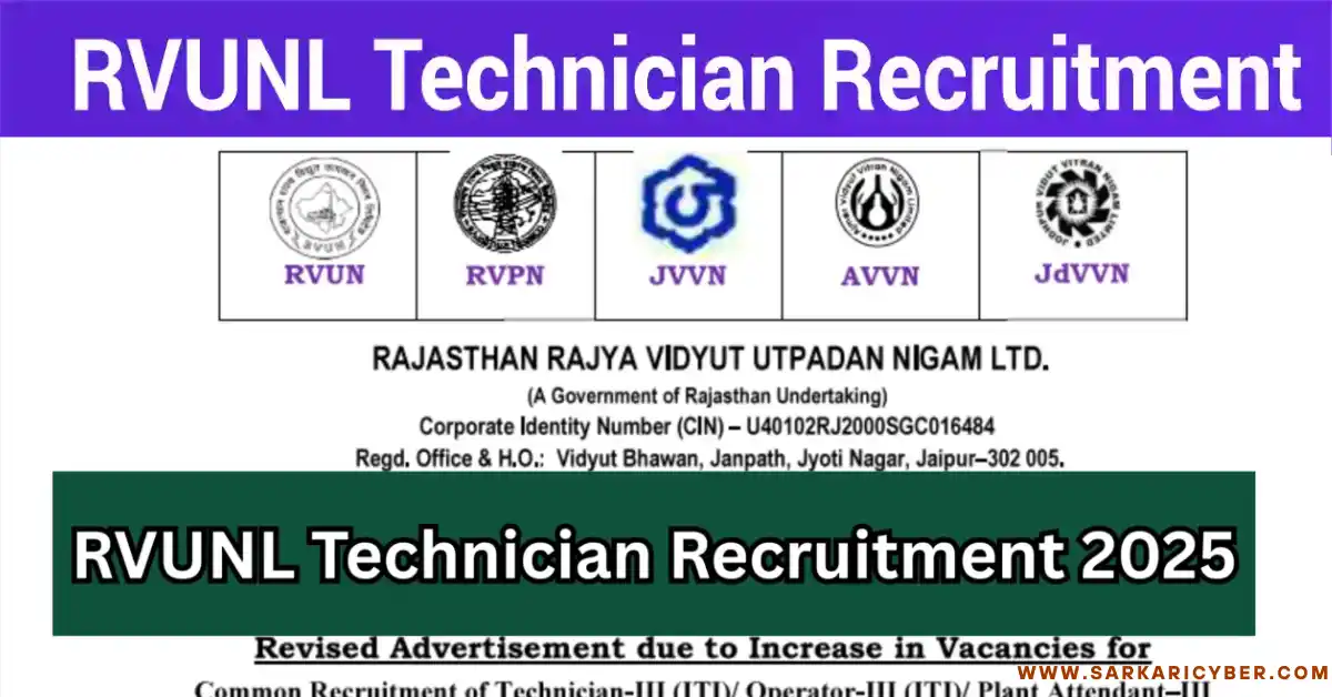 | Rajasthan Rajya Vidyut Utpadan Nigam Ltd (RRVUNL) for various power companies (RVUN, JVVN, AVVN, JdVVN) RRVUNL Technician III Recruitment 2025 Advt No. : RVUNL/ Rectt-2024/03 & Re-Advt.No: RVUNL/ Rectt-2024/06 / Quick Overview of Notification. WWW.SARKARICYBER.COM | |||||||||