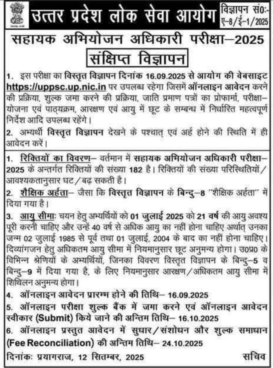 About Post: Uttar Pradesh Public Service Commission (UPPSC) has released a vacancy for this UPPSC APO Recruitment 2025. Any candidate who wants to apply can please apply from date 16/09/2025 to date 16/10/2025. For detailed information on how to apply, please read Advertisement No. A-8/E-1/2025 carefully and see the highlights below.